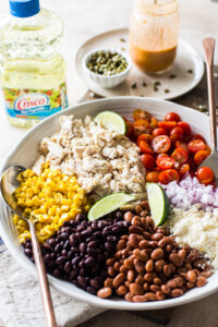 - DIVIDE salad greens onto serving plates. Drizzle lightly with dressing. Top with grapefruit, green onions and corn. Spoon chicken and pan juices over salads. Garnish with avocado and cilantro. Serve remaining dressing on the side.