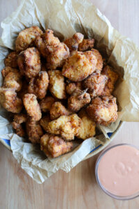 - Bread the chicken. In a shallow dish, whisk together the eggs, dairy-free milk, and salt. In another bowl, mix the flour, baking powder, garlic powder, onion powder, paprika, salt, and pepper. Season the chicken with liberally with salt & pepper. Then, dip each chicken piece into the egg mixture, then coat in the flour mixture. Set aside while you heat the shortening.